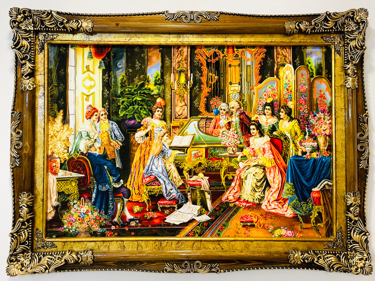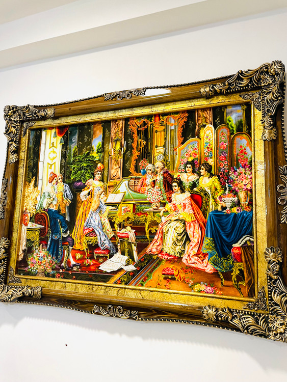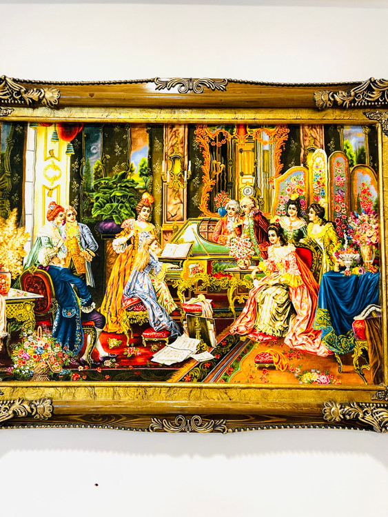 تابلو فرش ماشینی طرح پیانو زن ابعاد با قاب چوبی پرند ۱۲۰*۹۰