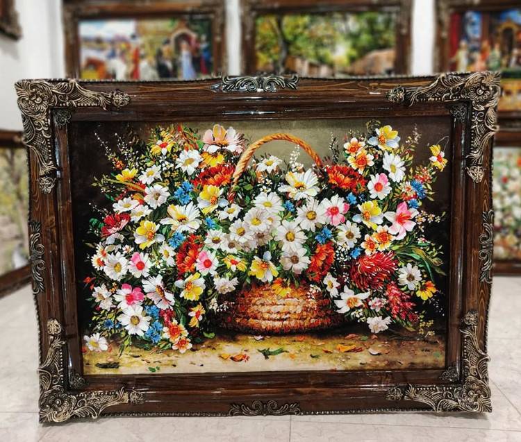 تابلو فرش ماشینی طرح سبد گل قاب چوبی پرند تبریز ابعاد با قاب: ۱۲۵۹۰ با قاب فقط: 2/600/