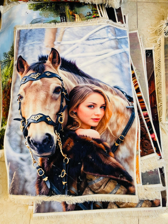 تابلو فرش ماشینی طرح دختر اسب سوار ابعاد با قاب چوبی پرند: ۱۲۰*۹۰ فرش ریز بافت ۱۲۰۰ شانه