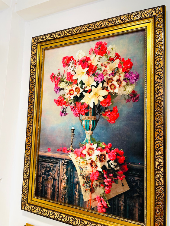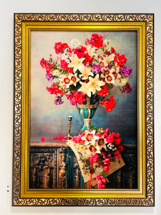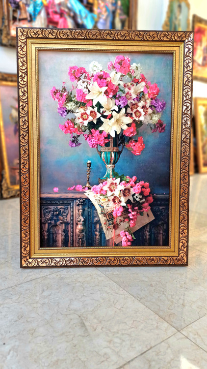 تابلو فرش ماشینی طرح گل و گلدان ابعاد با قاب ۱۲۰*۹۰ فرش ریزبافت ۱۲۰۰ شانه اعلاء رنگبندی و وضوح تصویر عالی قابل اجرا در دو نوع قاب pvc و چوبی